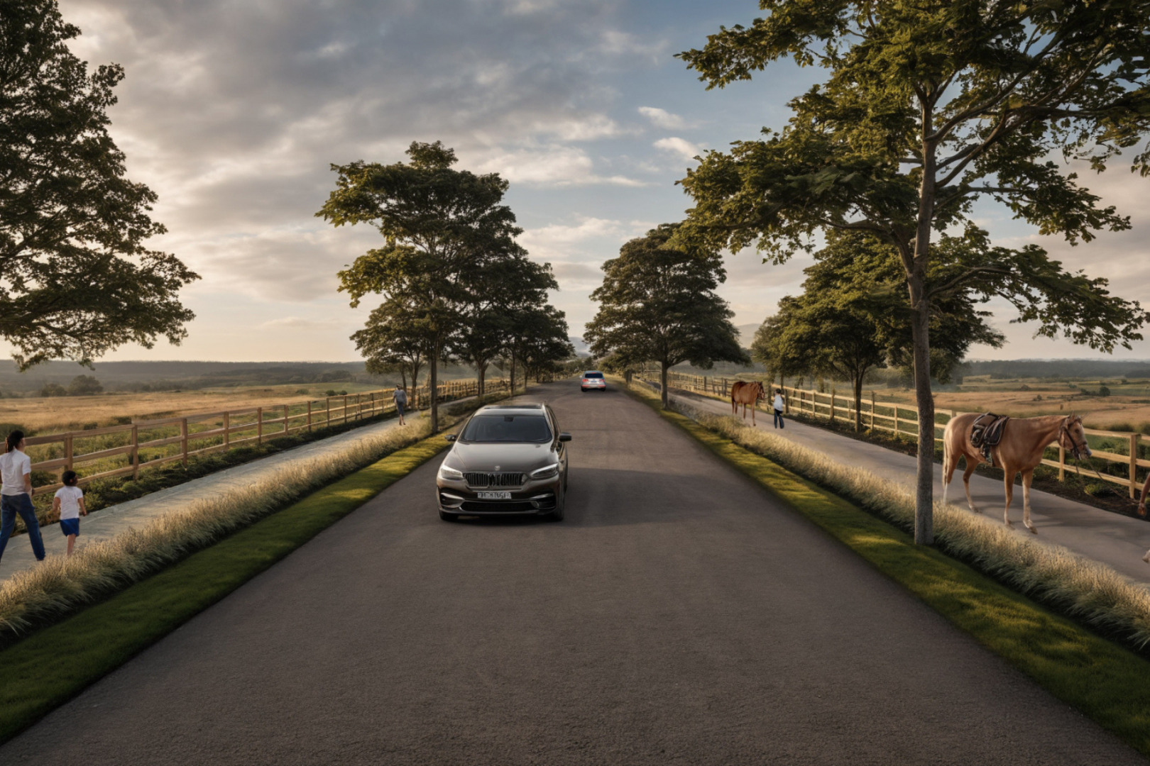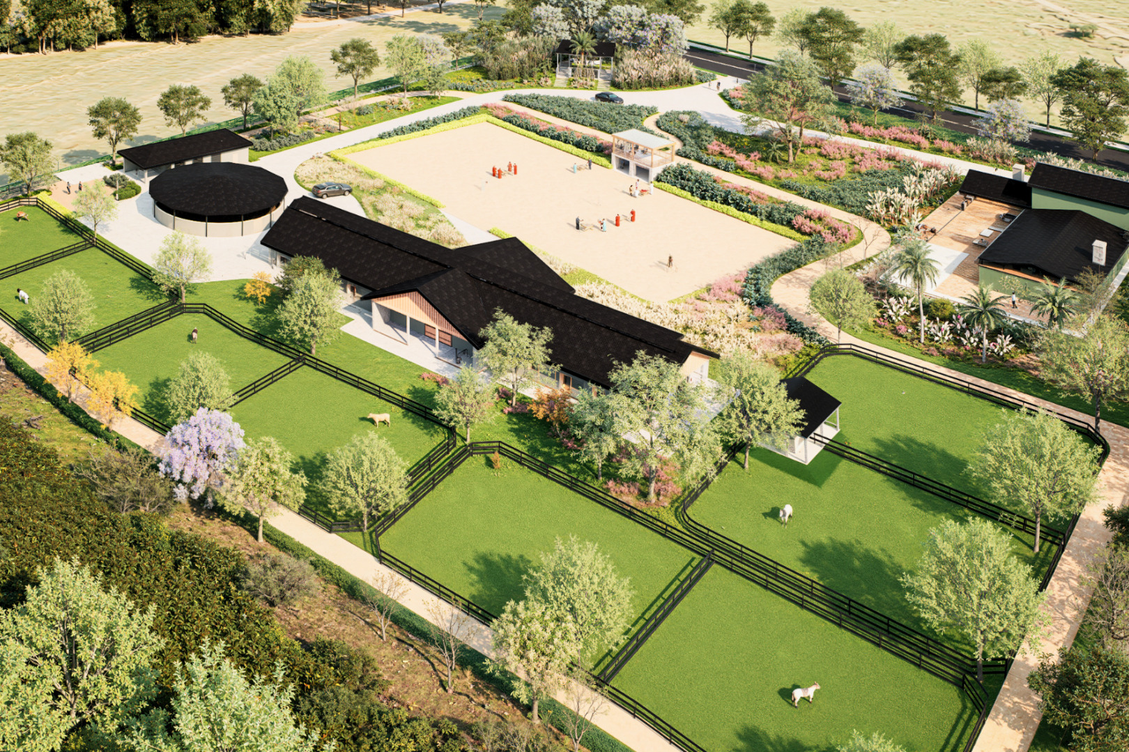 - Ruas internas planejadas com cavalovia e calçada para pedestres, proporcionando circulação segura e confortável para pessoas e cavalos