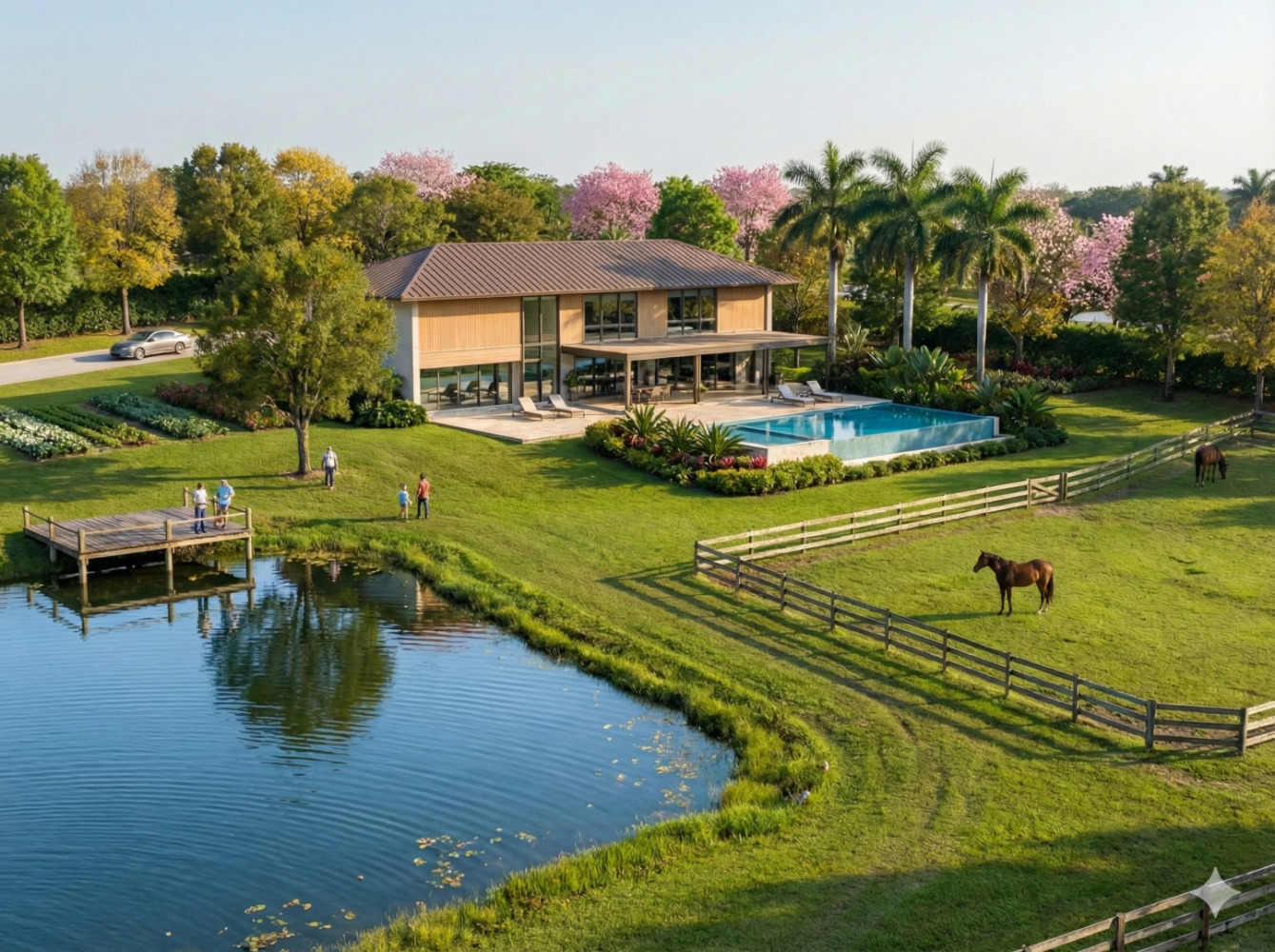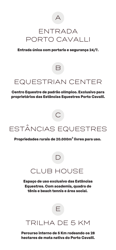- Cada Estância Equestre é uma propriedade rural individual, com matrícula própria, e todas são integradas a uma área de mais de 110 hectares, junto ao Porto Cavalli Equestrian Center